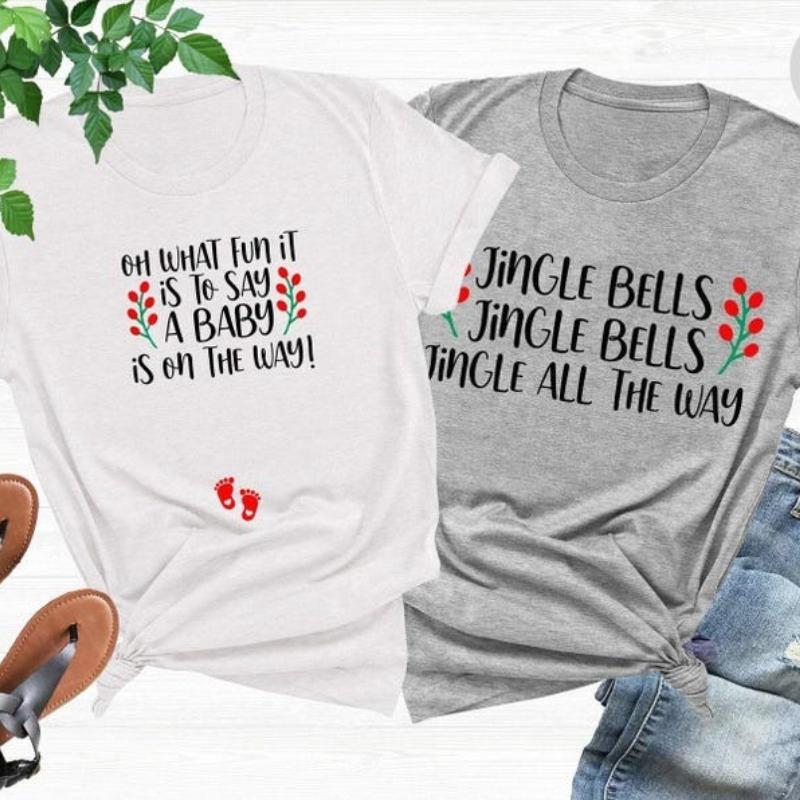 Couple Christmas Pregnancy AnnounceUnisext Xmas Maternity Tee Jingle Bells Baby on The Way Mom and Dad To Be Couple Pregnancy Tee