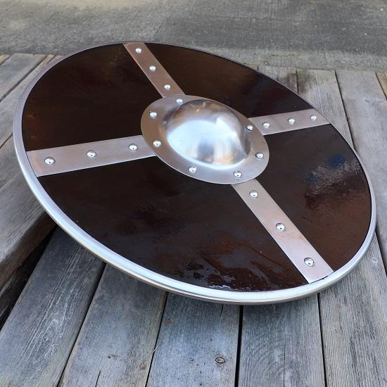 Hoogwaardige materialen Dit schild is gemaakt van duurzaam hout en verstevigd met stalen banden. Het is bestand tegen de ontberingen van gevechtsnaspelingen en -vertoningen.