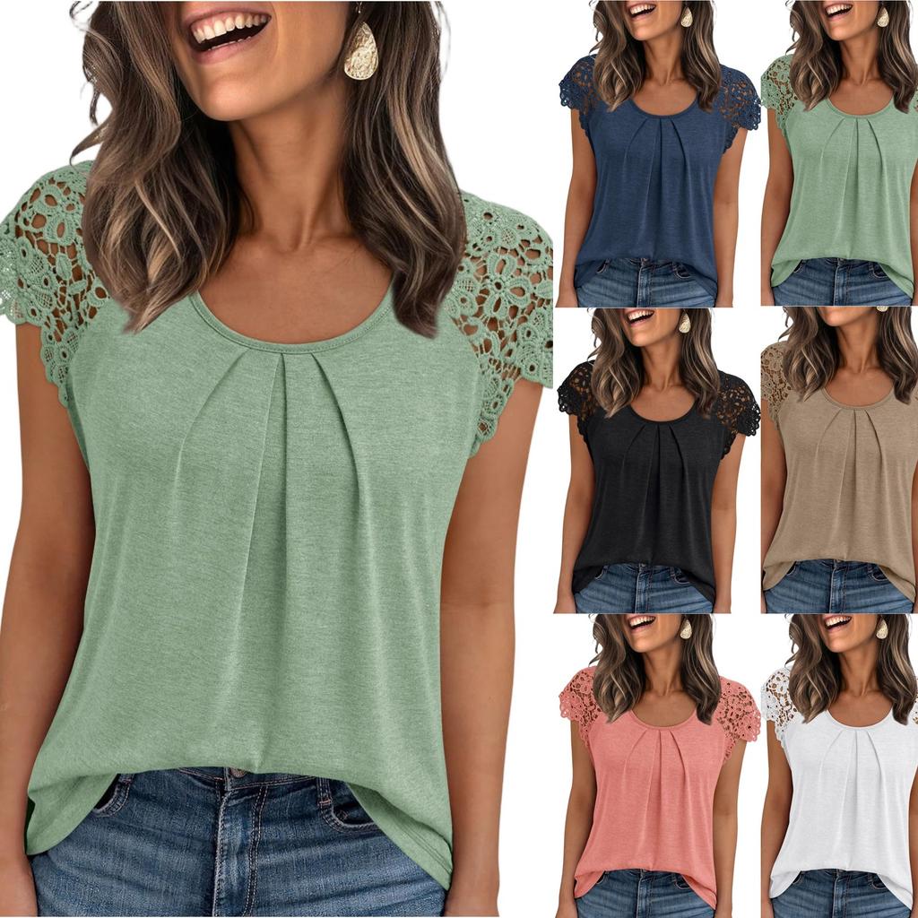 Women's Fashionable Casual Lace Sleeve Hollow Short Sleeved Round Neck T-Shirt Top