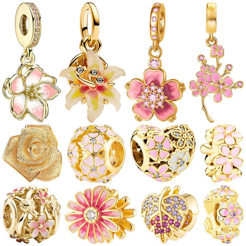 NIEUWE DIY Vergulde Sieraden Roze Kers Verwarde Sundrop Bloem Bedeltje Roos Margriet Bedels Passend voor Armband Vrouwen Cadeau