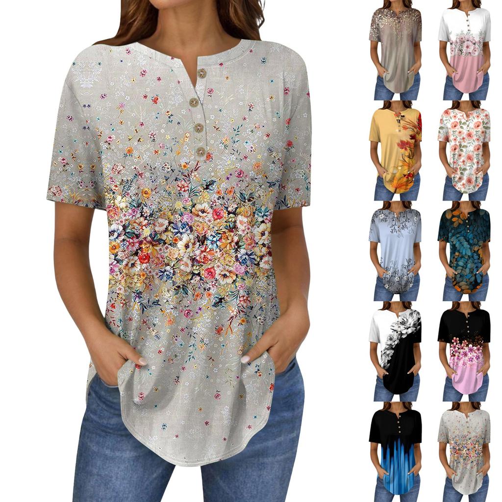 Korte Mouw Dames Tops Zomer T-shirts Bloemenprint V-hals Casual Basis T-shirt Knopenhemden Tuniek Tops