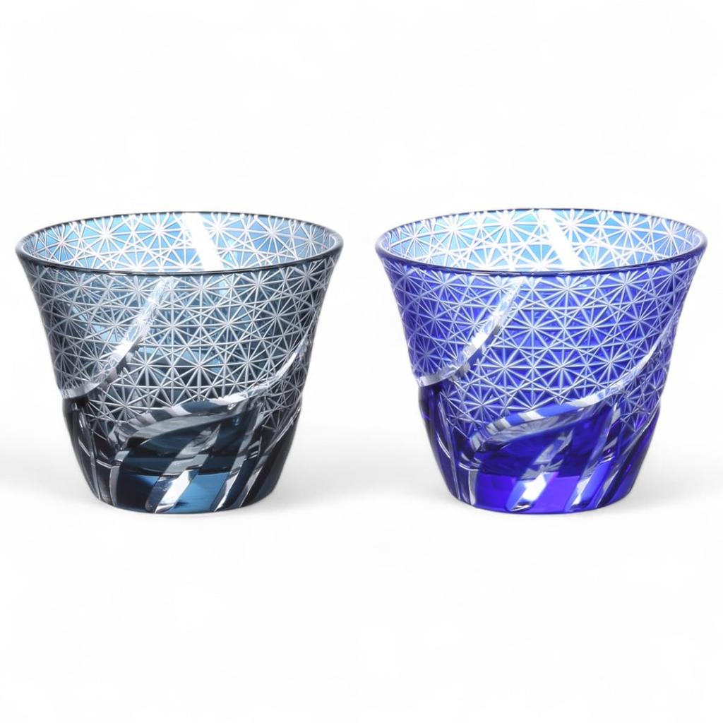 Mizukage Kiriko Pair Glasses Cups for Cold Tea 100cc Random Carving Small Pattern Ink Blue Blue with Engraved Base Bishou Current Model J-kitchens