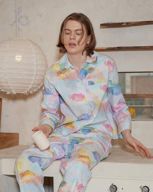 Experience ultimate comfort with this Watercolor Sky Cotton Pajama Set, designed for versatile wear. Crafted from premium cotton, it ensures a soft touch against the skin and excellent breathability. The beautiful watercolor sky print adds a serene and stylish touch, making it perfect for unwinding at home while maintaining a chic aesthetic. Its relaxed fit guarantees unrestricted movement and a truly comfortable experience for everyone.
