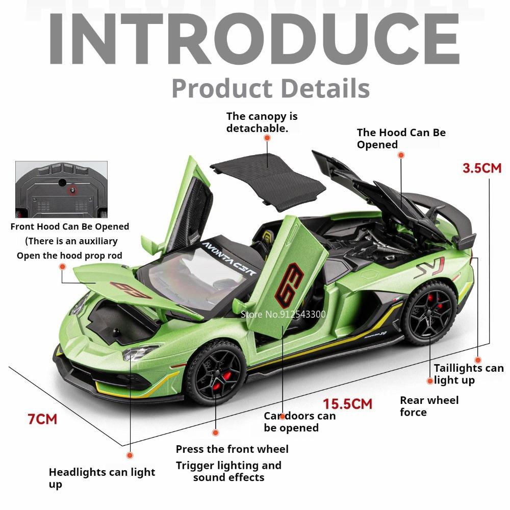 1:32 Scale SVJ63 Revuelto Sports Car Model Toy Alloy Body Rubber Tires Sound Light Supercar Models Kids Collection Presents
