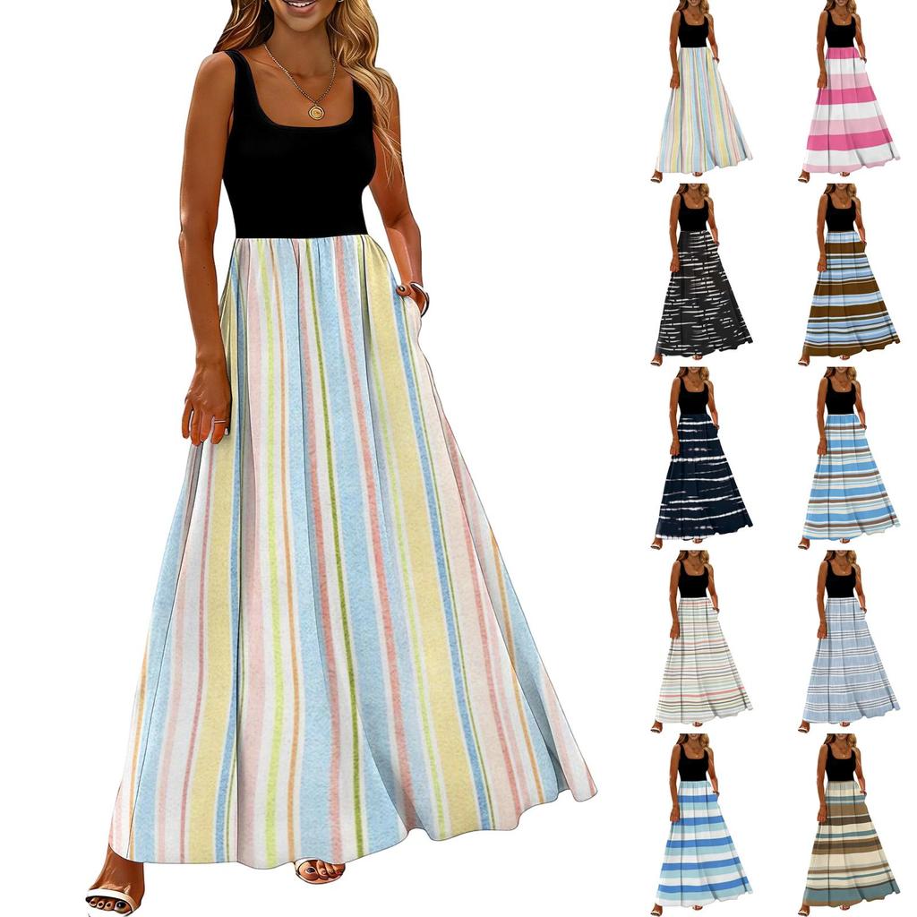 Ladies' striped printed summer casual and fashionable sleeveless long dress