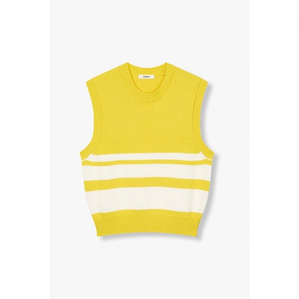 The Striped Knit Vest (9106152100) embodies a classic mood, with its striped pattern serving as a focal point. This item can be easily layered over shirts or t-shirts to enhance style completeness. It uses sturdy yet cool-feeling cotton tube yarn, making it perfect for the SS season. The neck and hem feature robust rib details to minimize shape distortion. It boasts a versatile design that matches well with various items, available in two colors: yellow and black.
