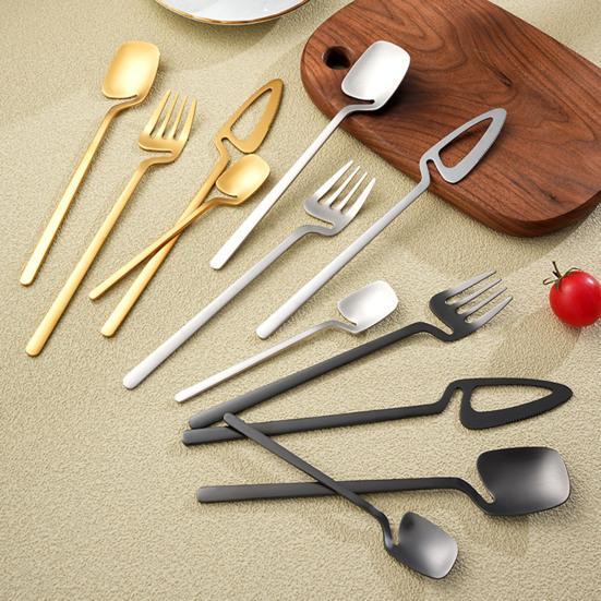 Innovatief 4-delig hangend ontwerp: Deze unieke set bevat een mes, lepels en vork die handig kunnen worden opgehangen met het creatieve ophangmechanisme.. Het ontwerp maakt eenvoudig opbergen mogelijk door het aan de rand van bekers of kommen te hangen, voorkomt schudden en houdt uw eethoek georganiseerd.