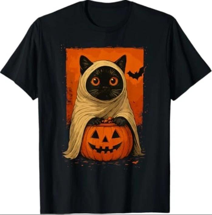 Funny Vintage Black Cat Halloween Pumpkin Spooky Ghost Women T-Shirt