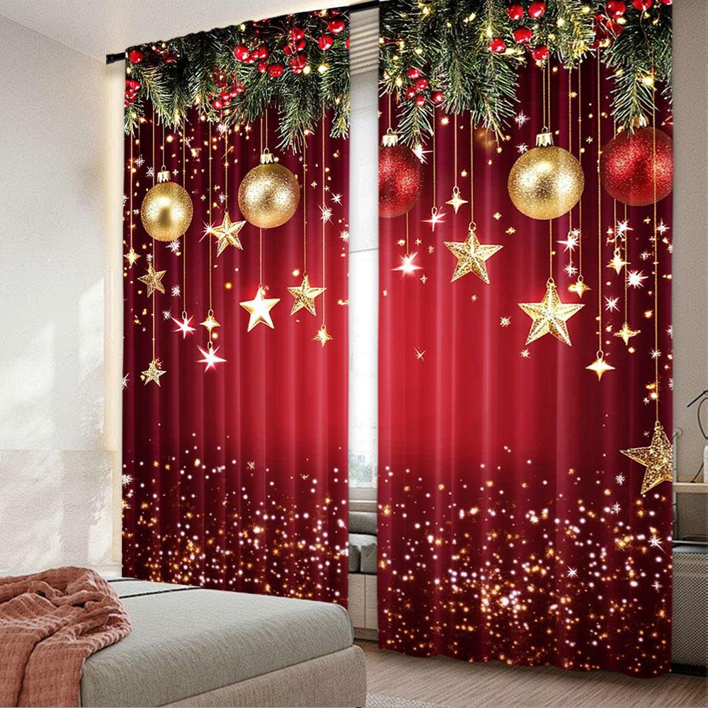 Set Of 2 Christmas Curtain Red Sparkling Stars Backdrop New Year Eve Party Xmas Holiday Decorations Curtains Made Polyester