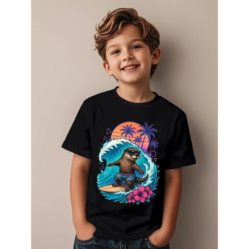 European sizes Unisex Otter Surfing T-Shirt | Cute Surfing Otter and Wave Print, Hawaiian Hibiscus and Surfboard Design