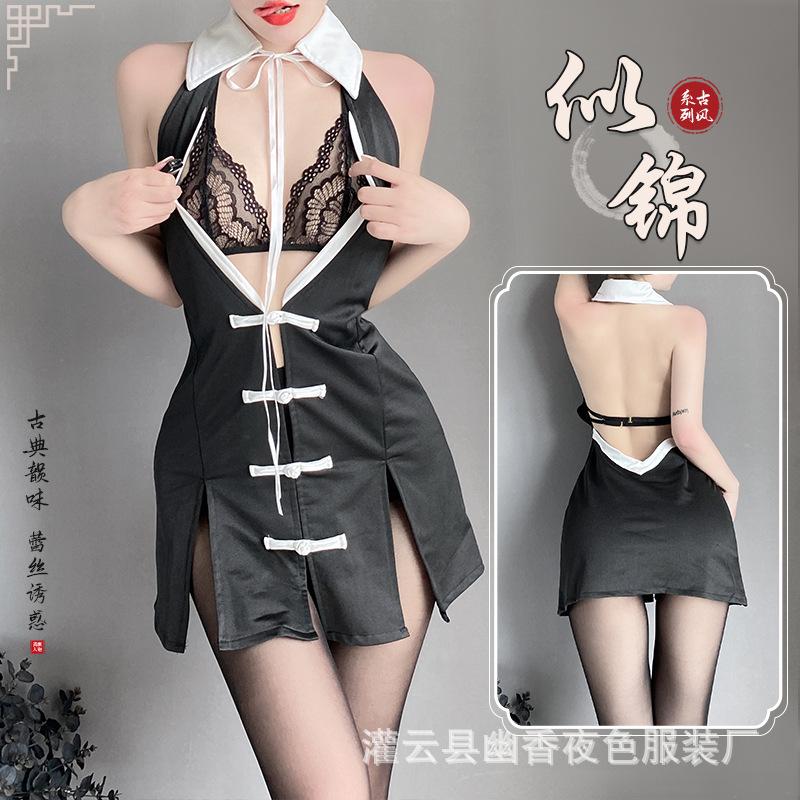 Erotic underwear women's lace free teasing perspective hollowed-out sexy cheongsam suit uniform temptation