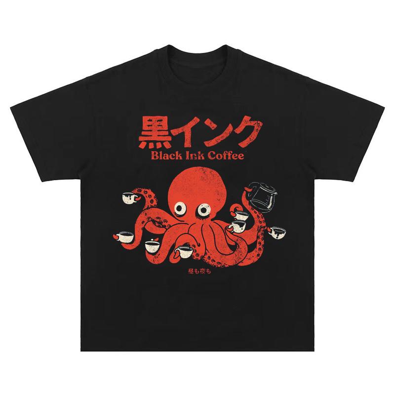 The Coffeedrinking Octopus Quirky and Amusing American Casual Retro Shortsleeved Tshirt for Men and Women