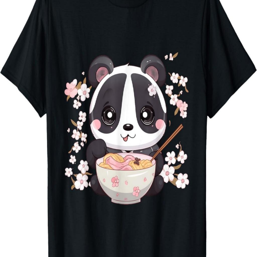 Otaku Kawaii Anime Panda Eat Ramen Noodles Cherry Blossom T-Shirt(7)